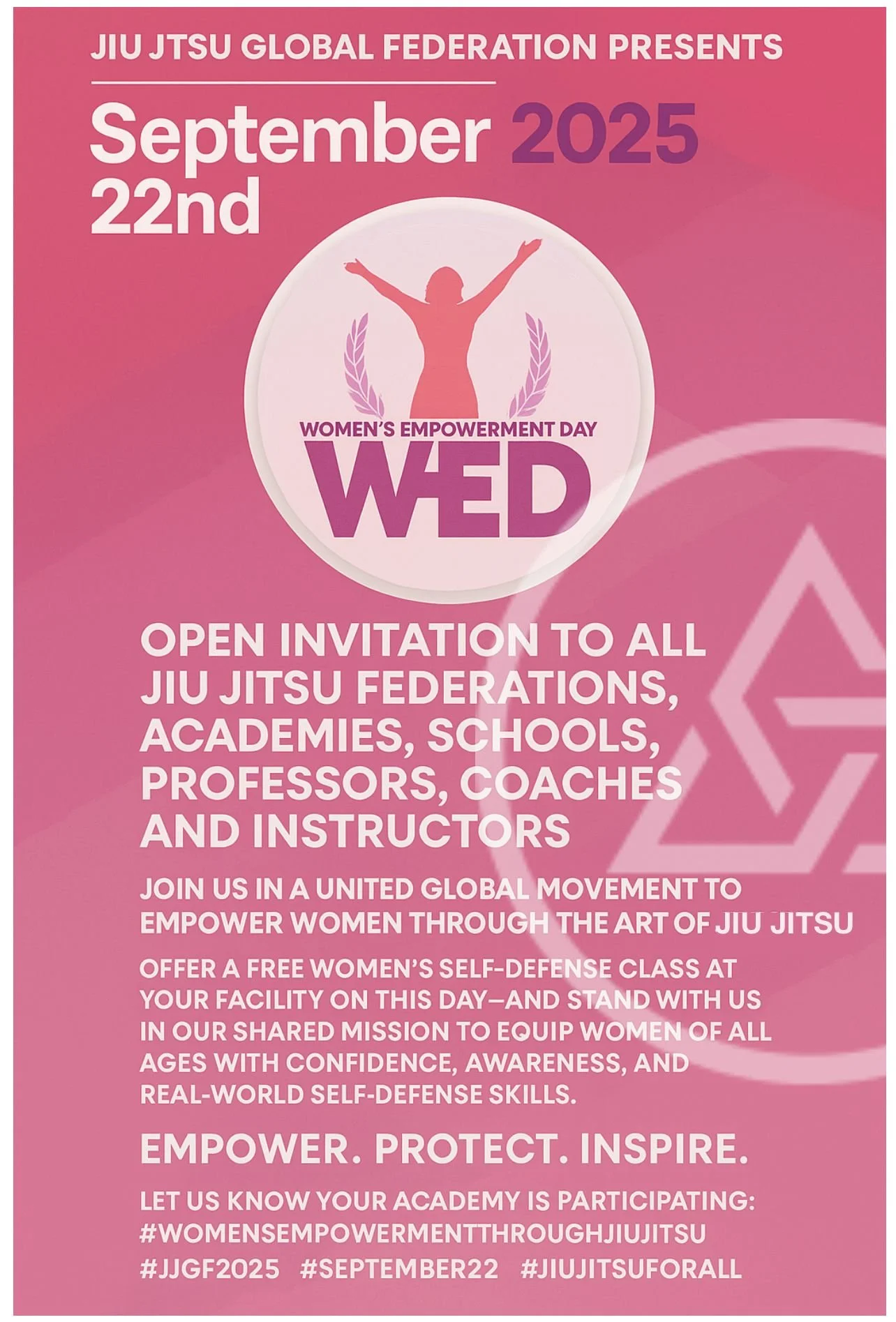 Welcome to the JJFS and Jiu-Jitsu Global Federation Women's Empowerment Day! This special event is exclusively dedicated to women, focusing on the transformative power of Jiu-Jitsu as a self-defense practice. Join us as we celebrate the strength and resilience of women worldwide, equipping them with essential skills to enhance personal safety. Through empowering self-defense training and fostering a supportive community, we aim to inspire women to embrace their inner strength and confidently navigate any situation. This Women's Empowerment Day is a testament to the unity and empowerment of women through Jiu-Jitsu, promoting courage, confidence, and personal empowerment for all participants.
